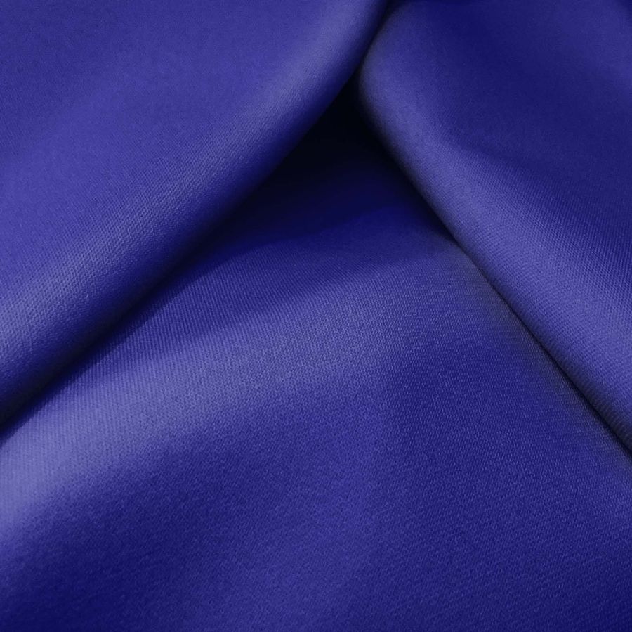 La tela base, Sarga Bielástica - Lisboa, es una tela resistente y elástica compuesta por un 97% de poliéster y un 3% de elastano, con un gramaje de 209 gr/m2 y un ancho de 150 cm. El color liso impreso es Azul medianoche, que refleja el contenido del CMYK de 100 95 29 14, lo que le otorga un matiz oscuro y elegante. Este color secundario combina muy bien con tonos terrosos y neutros, así como con tonos más brillantes como el dorado y el plateado. Cabe destacar que la tela está impresa con el color liso a una sola cara por impresión digital textil, lo que implica que no es un tejido tintado sino impreso por una sola cara.