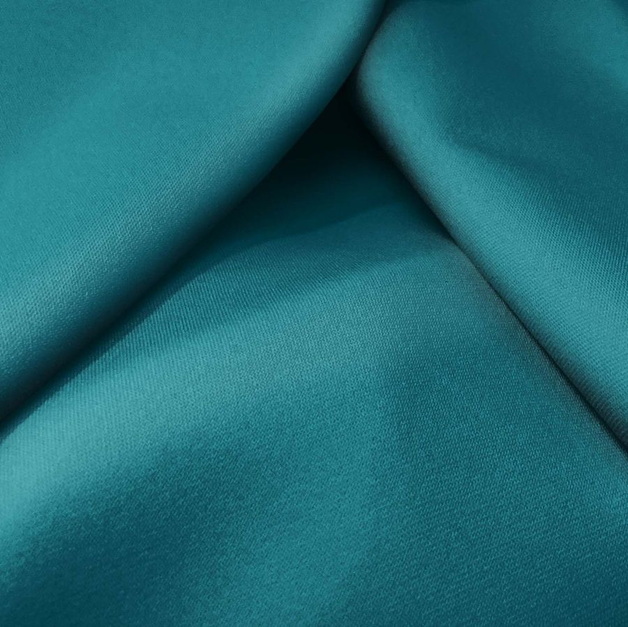 La tela base Sarga Bielástica - Lisboa, de composición 97% poliéster y 3% elastano, tiene un gramaje de 209 gr/m2, un ancho de 150 cm y un color liso impreso en tonalidades de Azul del Golfo, con un CMYK de 88, 40, 45 y 32. Este color transmite un sentimiento de serenidad y calma, combinando bien con tonalidades de verde, azul y gris. La tela está impresa con el color liso a una sola cara por impresión digital textil, lo que significa que no es un tejido tintado, sino impreso por una sola cara.