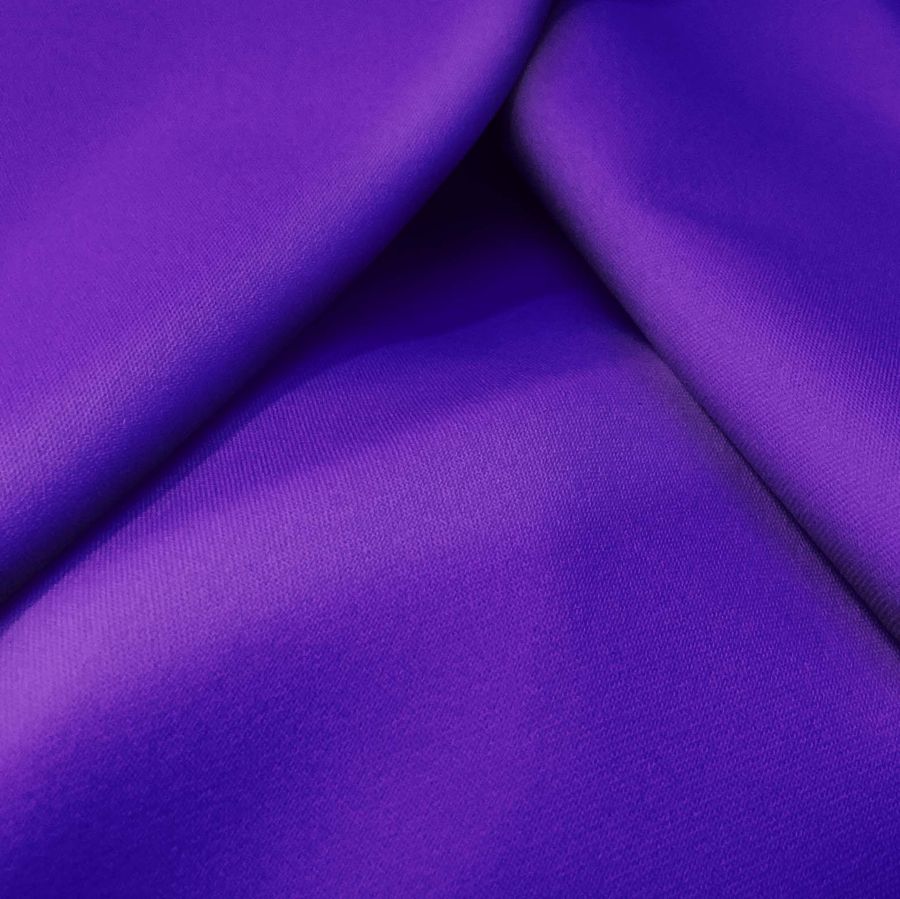 La tela está impresa con este color liso a una sola cara mediante impresión digital textil, lo que significa que el tejido no se tintó, sino que se imprimió una sola cara. La textura de la tela es bastante rugosa y elástica al tacto, aunque la presencia de elastano hace que la sensación general sea suave.