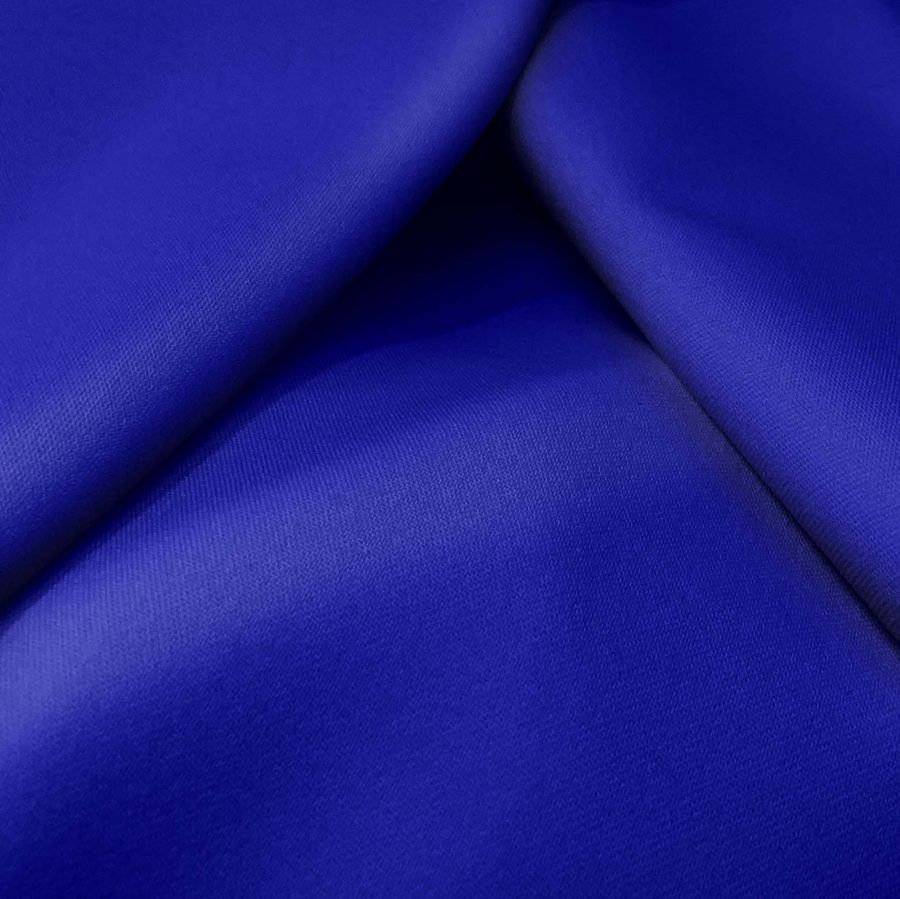 La tela base es la Sarga Bielástica - Lisboa, compuesta por un 97% de poliéster y un 3% de elastano, con un gramaje de 209 gr/m2 y un ancho de 150 cm. El color liso impreso es Azul/Azul marino, con un CMYK de 100 93 26 14. Este color representa un tono oscuro y profundo, que simboliza la tranquilidad y la confianza. El Azul combina particularmente bien con tonos tierra y colores neutros. La tela está impresa con este color a una sola cara por impresión digital textil.