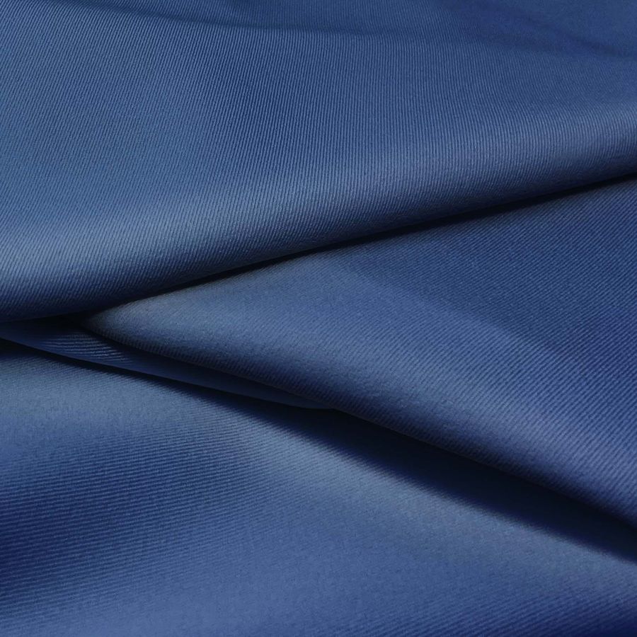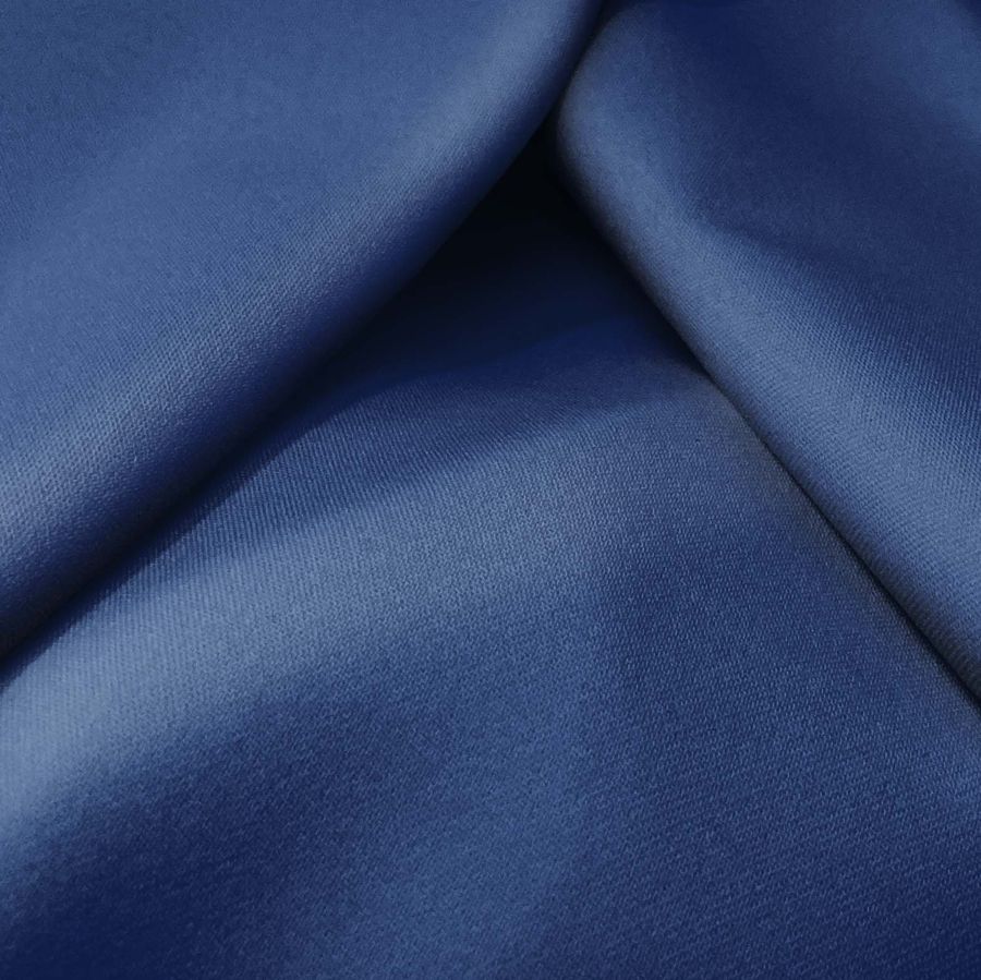 La tela base utilizada en este tejido es la sarga bielástica Lisboa, compuesta principalmente por poliéster y elastano, lo que le proporciona una textura rugosa y suave al tacto. El color liso impreso es un azul intenso similar al tono de la medianoche, con un CMYK de 100 83 34 25 y una combinación de tintas de cian, magenta, amarillo y negro.