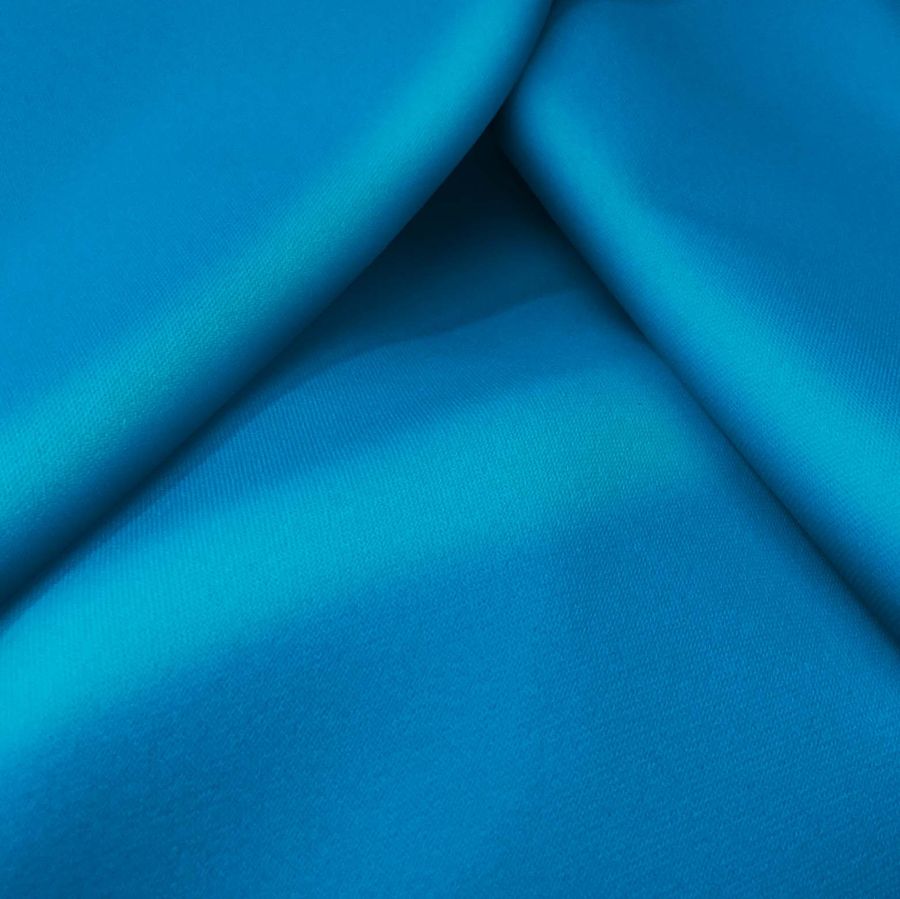 La tela base de esta prenda es la Sarga Bielástica - Lisboa, compuesta por un 97% de poliéster y un 3% de elastano, con un gramaje de 209 gr/m2 y un ancho de 150 cm. El color liso impreso es el Azul Phthalo, con un CMYK de 84 42 0 0. Este color es un azul brillante y luminoso, que se combina especialmente bien con tonos verdes y turquesas.