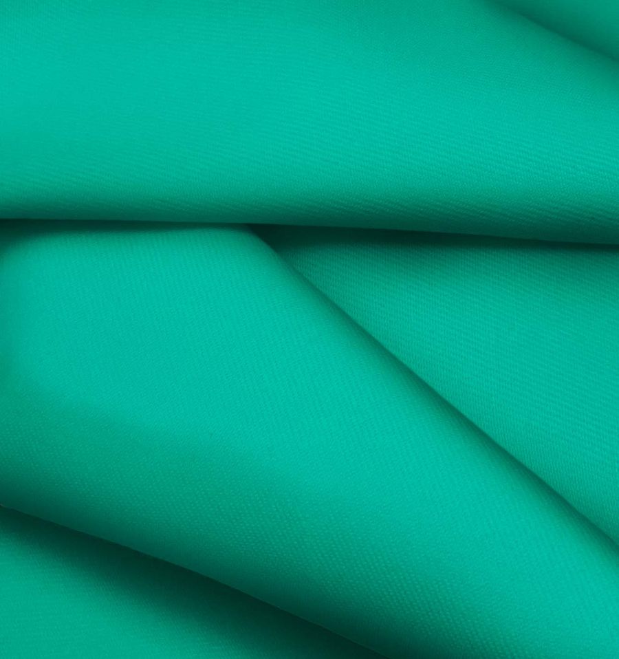 La tela base es la sarga de algodón orgánico Florencia, con una composición del 100% de algodón orgánico y un gramaje de 195 gr/m2. El color impreso es un verde acuático con un CMYK de 82 16 62 2. Este color simboliza la naturaleza, la tranquilidad y la frescura del agua. Este color se combina perfectamente con tonos tierra y beige, obteniendo un look natural y equilibrado. La tela está impresa con el color liso a una sola cara mediante impresión digital textil.