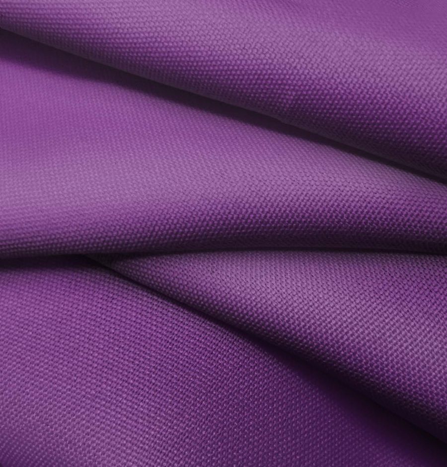 La tela base es el tejido técnico Tromso, compuesto al 100% de poliéster con un gramaje de 160 gr/m2 y un ancho de 150 cm. El color liso de esta tela es Morado Cambur, cuya mezcla CMYK es de 77 en cian, 100 en magenta, 24 en amarillo y 16 en negro. Este color, con un matiz de morado intenso y amarillo suave, se combina a la perfección con tonos verdes y grises, creando así un espectro cromático natural y equilibrado. Es importante mencionar que este tejido está impreso con el color liso a una sola cara por impresión digital textil, lo que significa que no es un tejido tintado sino impreso por una sola cara.