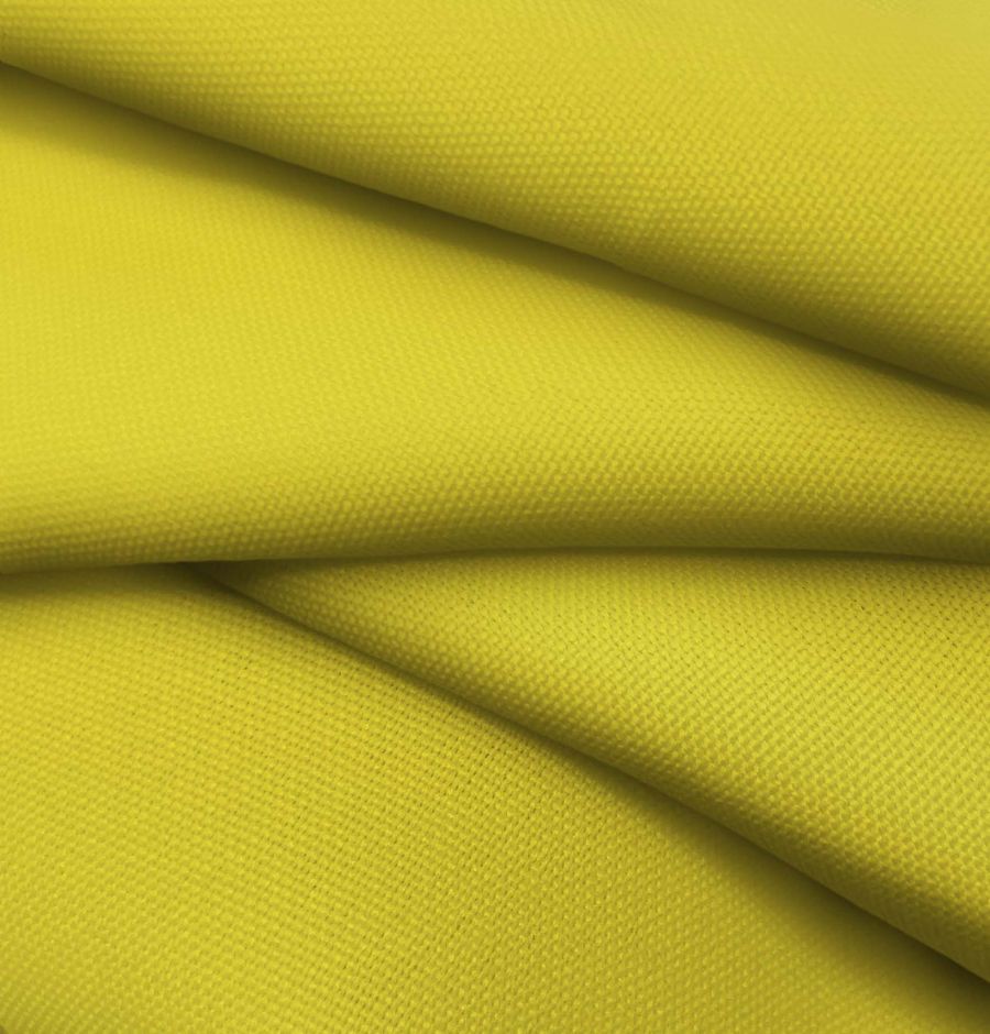 La tela base de esta muestra es el Tejido Hidrófugo Antibacteriano - Tromso, un tejido técnico de 100% poliéster con un gramaje de 160 gr/m2 y un ancho de 150 cm. El color liso impreso es un amarillo bambú, cuyo CMYK es 22 19 91 3. Este último detalle indica que se trata de un color predominante en amarillo y que tiene poquísima cantidad de tinta negra.