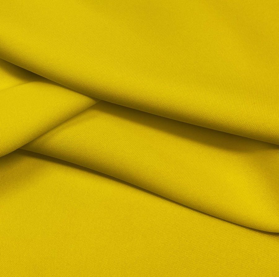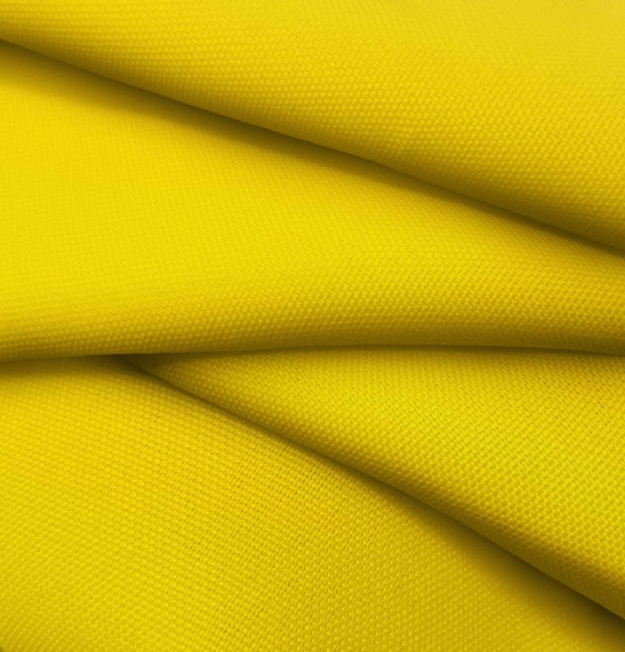 La tela base es el Tejido Hidrófugo Antibacteriano - Tromso, un tejido técnico compuesto al 100% de poliéster con un gramaje de 160 gr/m2 y un ancho de 150 cm. El color liso impreso es un amarillo primario con un CMYK de 1 24 93 0, lo que significa que está compuesto principalmente de tinta amarilla con una pequeña cantidad de tinta magenta y casi nada de tinta cian o negra. Este color se puede combinar especialmente bien con verdes, azules y grises.