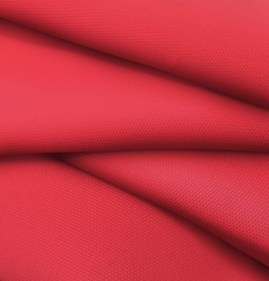La tela base es el Tejido Hidrófugo Antibacteriano - Tromso de 100% poliéster, con gramaje de 160 gr/m2 y un ancho de 150 cm. El color liso impreso es Rojo Pantone, con una composición de tinta de Cyan: 0, Magenta: 89, Yellow: 68, Black: 0 y un CMYK de 0 89 68 0.