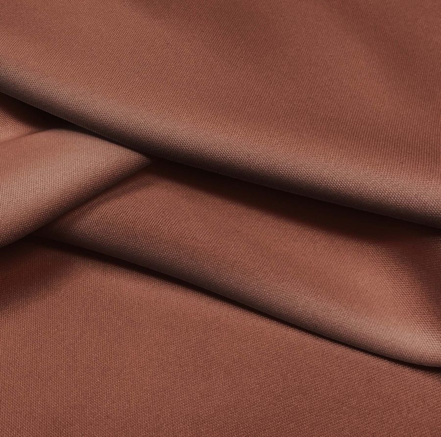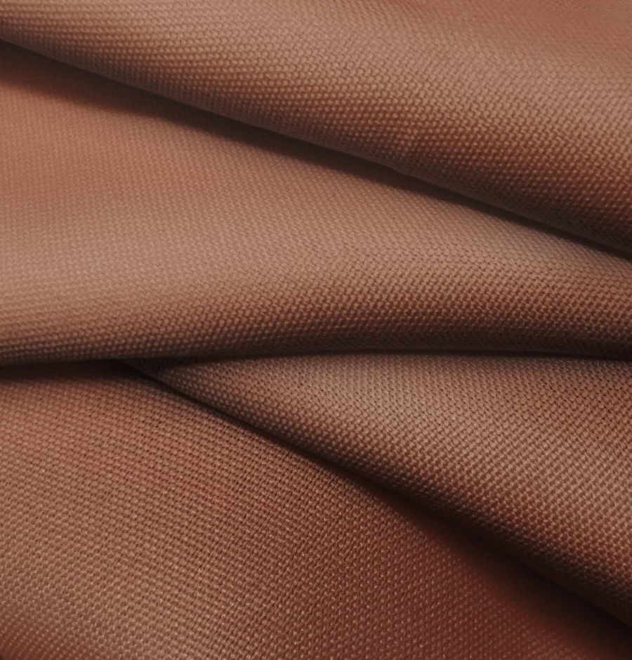 La tela base es el Tejido Hidrófugo Antibacteriano - Tromso, de composición 100% poliéster y un gramaje de 160 gr/m2. El color liso impreso es rojo-rojo marrón, con un CMYK de 36 71 75 50. El color secundario es una tonalidad cálida con matices terrosos, que combina en particular con colores como el beige, gris y verde oliva. Este tejido está impreso con el color liso a una sola cara por impresión digital textil, lo que significa que la tinta se aplica directamente sobre la fibra del tejido.
