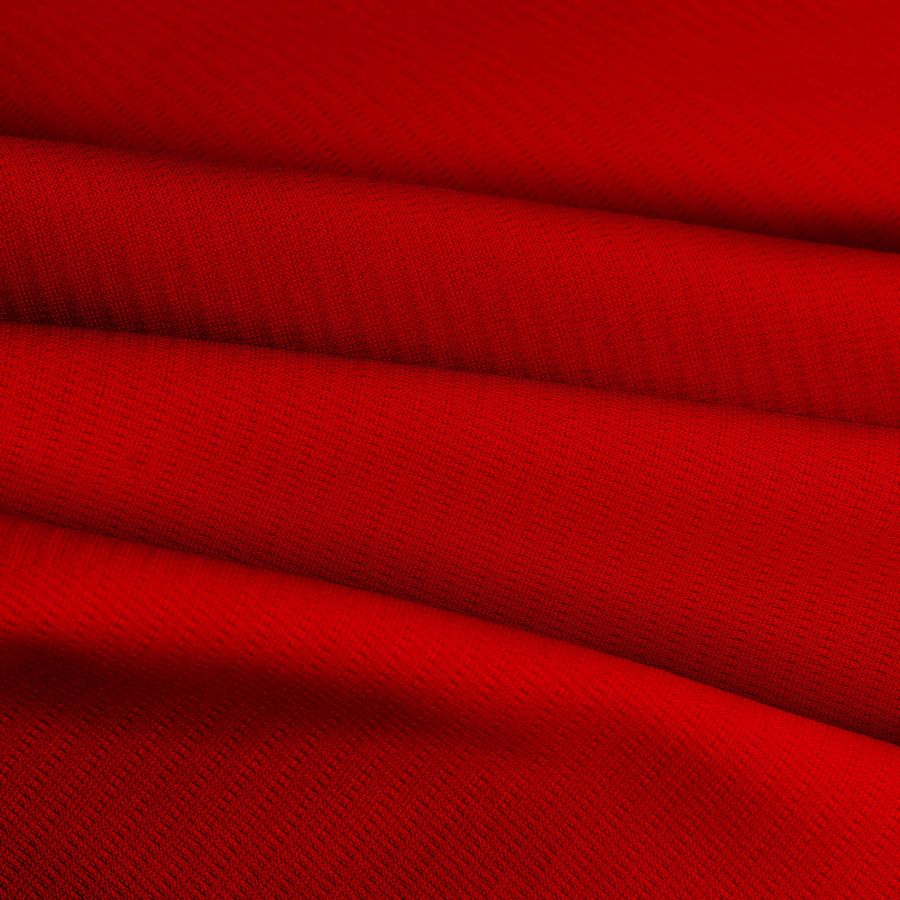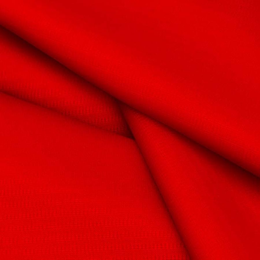 La tela base, denominada Tejido Técnico Transpirable - Fresh de 100% poliéster, es de gramaje liviano de 135 gr/m2 y posee una amplitud de 150 cm. Este tejido es transpirable y elástico, con una textura suave al tacto. El color liso impreso es de un intenso Rojo Langosta, obtenido mediante la técnica de sublimación con un CMYK de 0 98 100 0. Este color secundario es vibrante y cálido, el cual puede combinar perfectamente con tonalidades neutras como el blanco y negro, o con otros colores cálidos como dorados y naranjas.