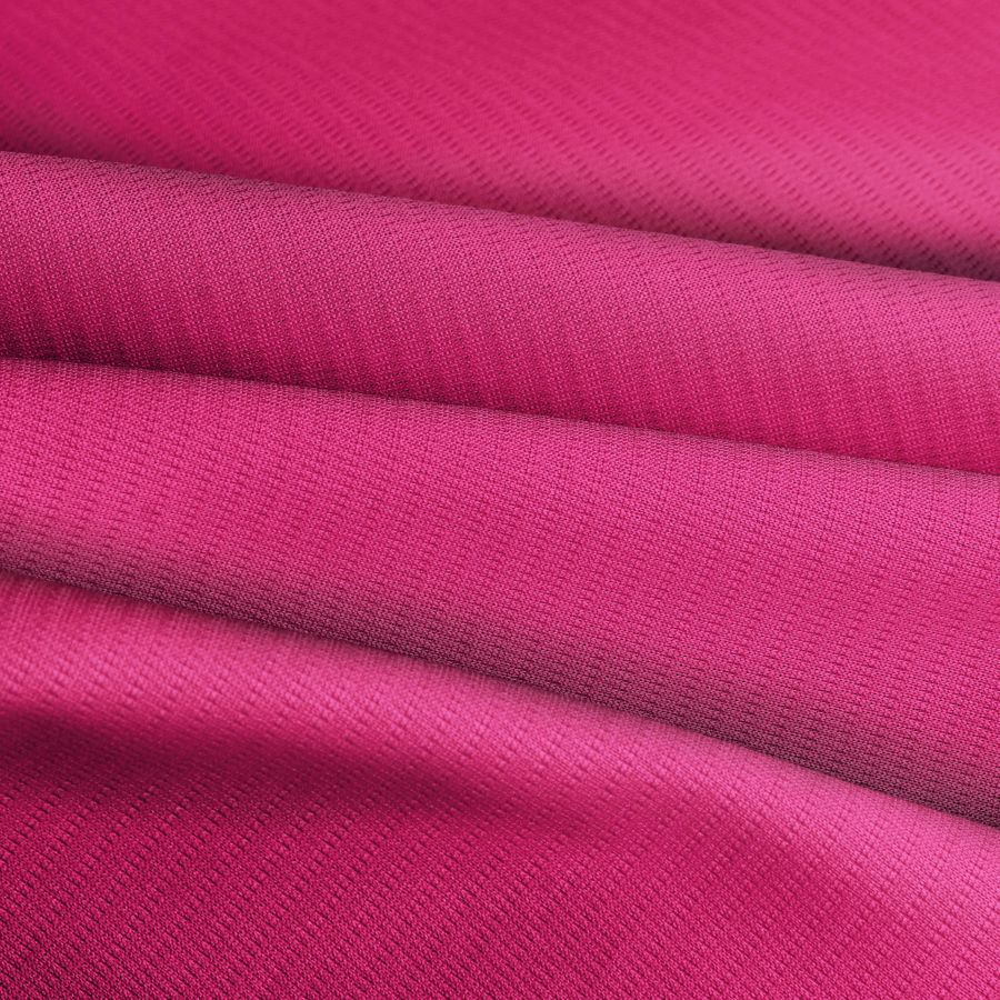 La tela base del tejido técnico transpirable Fresh es un tejido técnico de poliéster de 135 gr/m2, con un ancho de 150 cm. El color liso impreso es un rosa intenso llamado Razzmatazz CMYK (2, 94, 29, 0). Este color se describe como un tono fuerte y vibrante que aporta vitalidad y energía a cualquier prenda o accesorio. Combina especialmente bien con otros tonos vibrantes como amarillos, verdes y turquesas, creando una paleta de colores perfecta para deportes y actividades al aire libre.