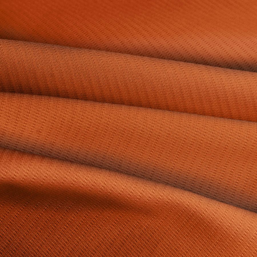 La tela base es el Tejido Técnico Transpirable - Fresh, compuesta por 100% poliéster con un gramaje de 135 gr/m2 y un ancho de 150 cm. El color liso impreso es Marrón Herrumbre, con un CMYK de 20 83 100 11. Este color se caracteriza por su tonalidad oscura y cálida, manifestando un aspecto de rusticidad, estabilidad y seguridad. El marrón herrumbre combina bien con tonalidades amarillas, verdes y rojas, aportando un aspecto territorial, natural y harmonioso. El tejido se imprime a una sola cara por impresión digital textil, obteniendo una estampación precisa, nítida y de alta calidad.