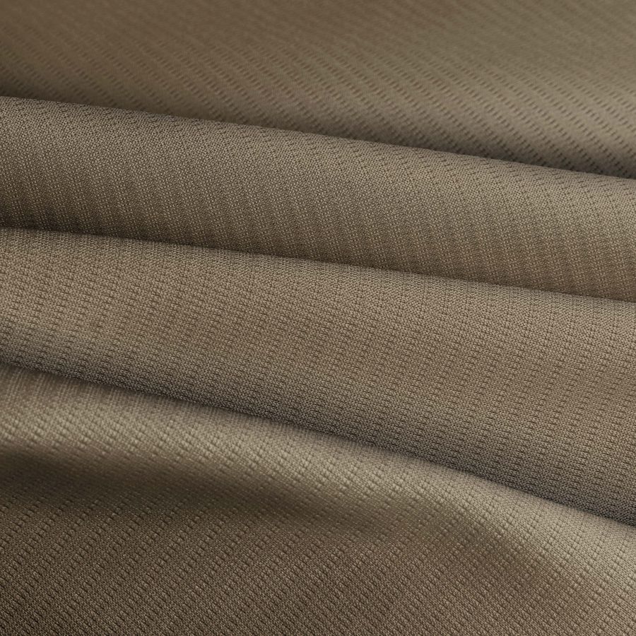 La tela base de este tejido técnico es una composición de 100% poliéster con un gramaje de 135 gr/m2 y una anchura de 150cm. Su color liso impreso es un marrón olivo de intensidad media cuyo CMYK es de 46 48 64 42.